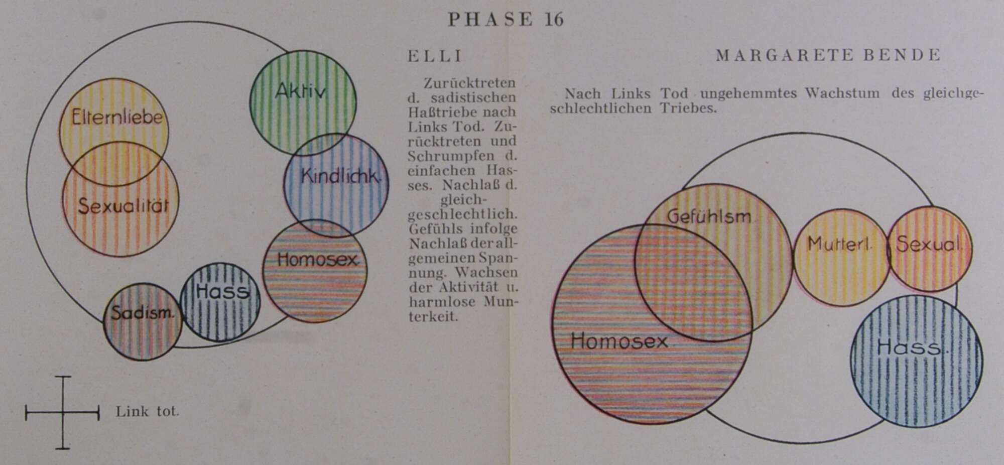 Zurücktreten d. sadistischen Haßtriebe nach Links Tod. Zurücktreten und Schrumpfen d. einfachen Hasses. Nachlaß d. gleichgeschlechtlich. Gefühls infolge Nachlaß der allgemeinen Spannung. Wachsen der Aktivität u. harmlose Munterkeit.