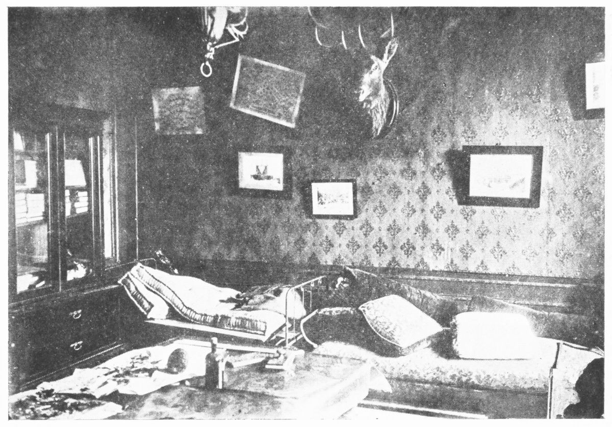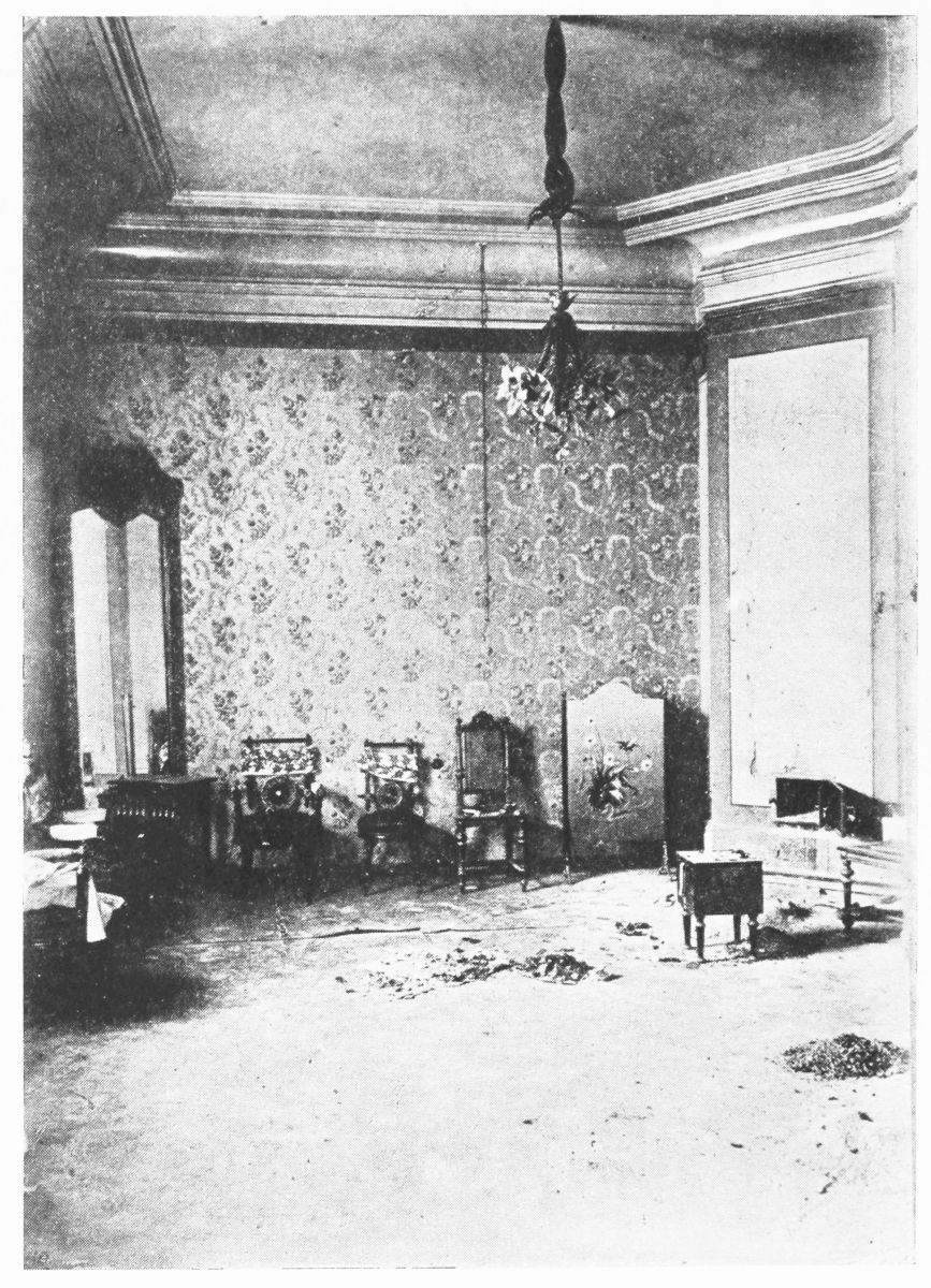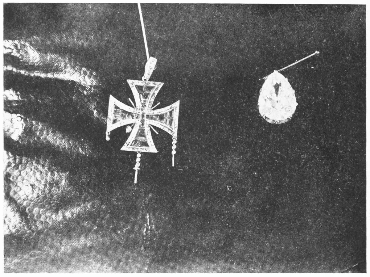 After Tchemodouroff’s arrival Mr. Gibbes and myself went to Yekaterinburg for the purpose of giving assistance to Sergeeff, a member of the court. Tchemodouroff told us that Sergeeff was in charge of the investigation of the fate of the imperial family. Together with Sergeeff we visited the Ipatieff house and inspected the room that had the bullet holes on the wall and on the floor. In this house I found two “Egyptian signs” which the empress had the habit of drawing on various things for good luck. One of these signs I noticed on the wall paper of her majesty’s room, the other on the side of the window in a room where, under the Egyptian sign, the date was written in pencil: 17/30 April—the date of the arrival of her majesty in Yekaterinburg. My attention was also attracted to the stoves; they were all full of various burned articles. I recognised a considerable number of burned things such as tooth- and hair-brushes, pins and a number of small things bearing the initials: “A. F.” [Alexandra Feodorovna.]