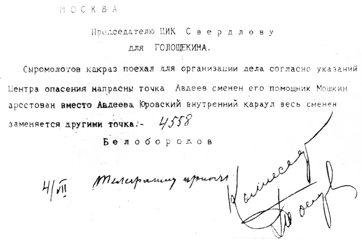 Later Kobylinsky received a wire from Nabokoff announcing the arrival of the party at Tumen. Greatly to the surprise of everybody Kobylinsky suddenly received a telegram from Matveieff stating that the emperor and all the persons in his party were held up in Yekaterinburg. This was quite unexpected, as we all thought that the emperor was to be taken to Moscow.{30}