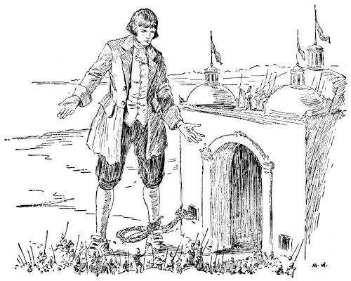 I then made another sign that I wanted drink. They found by my eating that a small quantity would not suffice me; and being a most ingenious people, they slung up, with great dexterity, one of their largest hogsheads, then rolled it towards my hand, and beat out the top; I drank it off at a draught, which I might well do, for it did not hold half a pint, and tasted like a small wine of[12] Burgundy, but much more delicious. They brought me a second hogshead, which I drank in the same manner, and made signs for more: but they had none to give me. When I had performed these wonders they shouted for joy, and danced upon my breast, repeating several times as they did at first, Hekinah degul. They made me a sign that I should throw down the two hogsheads, but first warned the people below to stand out of the way, crying aloud, Borach mevola: and when they saw the vessels in the air there was a universal shout of Hekinah degul. I confess I was often tempted, while they were passing backwards and forwards on my body, to seize forty or fifty of the first that came in my reach and dash them against the ground. But the remembrance of what I had felt, which probably might not be the worst they could do, and the promise of honor I made to them—for so I interpreted my submissive behavior—soon drove out these imaginations. Besides, I now considered myself as bound by the laws of hospitality to a people who had treated me with so much expense and magnificence. However, in my thoughts I could not sufficiently wonder at the intrepidity of these diminutive mortals, who durst venture to mount and walk upon my body while one of my hands was at liberty, without trembling at the very sight of so prodigious a creature as I must appear to them. After some time, when they observed that I made no more demands for meat, there appeared before me a person of high rank from his imperial majesty. His excellency, having mounted on the small of my right leg, advanced forwards up to my face, with about a dozen of his retinue, and producing his credentials under the signet royal, which he applied close to my eyes, spoke[13] about ten minutes without any signs of anger, but with a kind of determinate resolution: often pointing forwards, which, as I afterwards found, was towards the capital city, about half a mile distant, whither it was agreed by his majesty in council that I must be conveyed. I answered in few words, but to no purpose, and made a sign with my hand that was loose, putting it to the other (but over his excellency’s head for fear of hurting him or his train), and then to my own head and body, to signify that I desired my liberty. It appeared that he understood me well enough, for he shook his head by way of disapprobation, and held his hands in a posture to show that I must be carried as a prisoner. However, he made other signs, to let me understand that I should have meat and drink enough, and very good treatment. Whereupon I once more thought of attempting to break my bonds; but again, when I felt the smart of their arrows upon my face and hands, which were all in blisters, and many of the darts still sticking in them, and observing likewise that the number of my enemies increased, I gave tokens to let them know that they might do with me what they pleased. Upon this the hurgo and his train withdrew, with much civility and cheerful countenances. Soon after I heard a general shout, with frequent repetitions of the words, peplom selan; and I felt great numbers of people on my left side relaxing the cords to such a degree that I was able to turn upon my right. But, before this, they had daubed my face and both my hands with a sort of ointment, very pleasant to the smell, which in a few minutes removed all the smart of their arrows. These circumstances, added to the refreshment I had received by their victuals[14] and drink, which were very nourishing, disposed me to sleep. I slept about eight hours, as I was afterwards assured; and it was no wonder, for the physicians, by the emperor’s order, had mingled a sleepy potion in the hogsheads of wine.