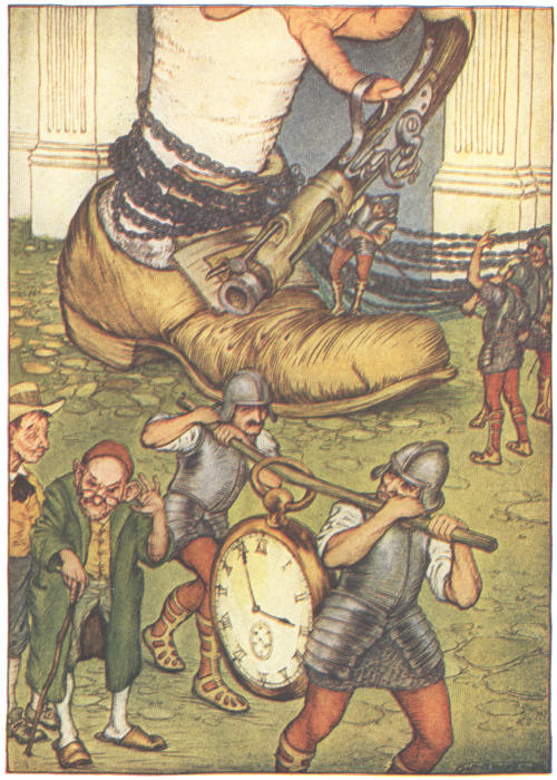 At the place where the carriage stopped there stood an ancient temple, esteemed to be the largest in the whole kingdom, which, having been polluted some years before by an unnatural murder, was, according to the zeal of those people looked upon as profane, and therefore had been applied to common uses, and all the ornaments and furniture carried away. In this edifice it was determined I should lodge. The great gate fronting to the north was about four feet high and almost two feet wide, through which I could easily creep. On each side of the gate was a small window, not above six inches from the ground; into that on the left side the king’s smiths conveyed fourscore and eleven chains, like those that hang to a lady’s watch in Europe, and almost as large, which were locked to my left leg with six-and-thirty padlocks. Over against this temple, on the other side of the great highway, at twenty feet distance, there was a turret at least five feet high. Here the emperor ascended, with many principal lords of his court, to have an opportunity of viewing me, as I was told, for I could not see[17] them. It was reckoned that above a hundred thousand inhabitants came out of the town upon the same errand; and, in spite of my guards, I believe there could not be fewer than ten thousand, at several times, who mounted my body, by the help of ladders. But a proclamation was soon issued to forbid it upon pain of death. When the workmen found it was impossible for me to break loose they cut all the strings that bound me; whereupon I rose up, with as melancholy a disposition as ever I had in my life. But the noise and astonishment of the people at seeing me rise and walk are not to be expressed. The chains that held my left leg were about two yards long, and gave me not only the liberty of walking backwards and forwards in a semicircle, but being fixed within four inches of the gate, allowed me to creep in and lie at my full length in the temple.