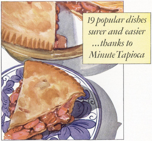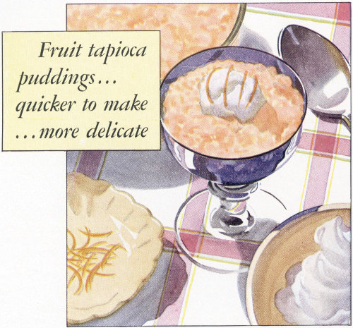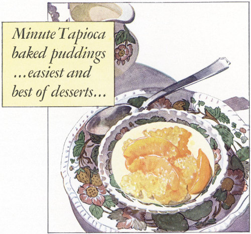 Imagine a tapioca cream pudding as creamy as a Bavarian, as rich as a custard, as light as a whip! Imagine a tapioca fruit pudding more delicately delicious than any you ever tasted in all your days! That’s what you get when you make puddings with the NEW Minute Tapioca!