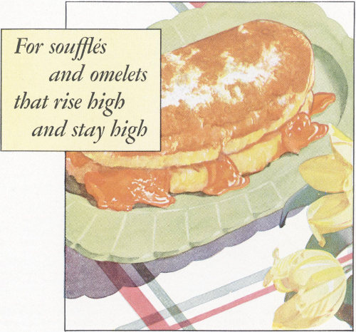 Prepare Fluffy Omelet (above). Spread apricot jam on baked omelet; then fold and dust with confectioners’ sugar. Serve hot as main dish for luncheon or supper. Serves 6.