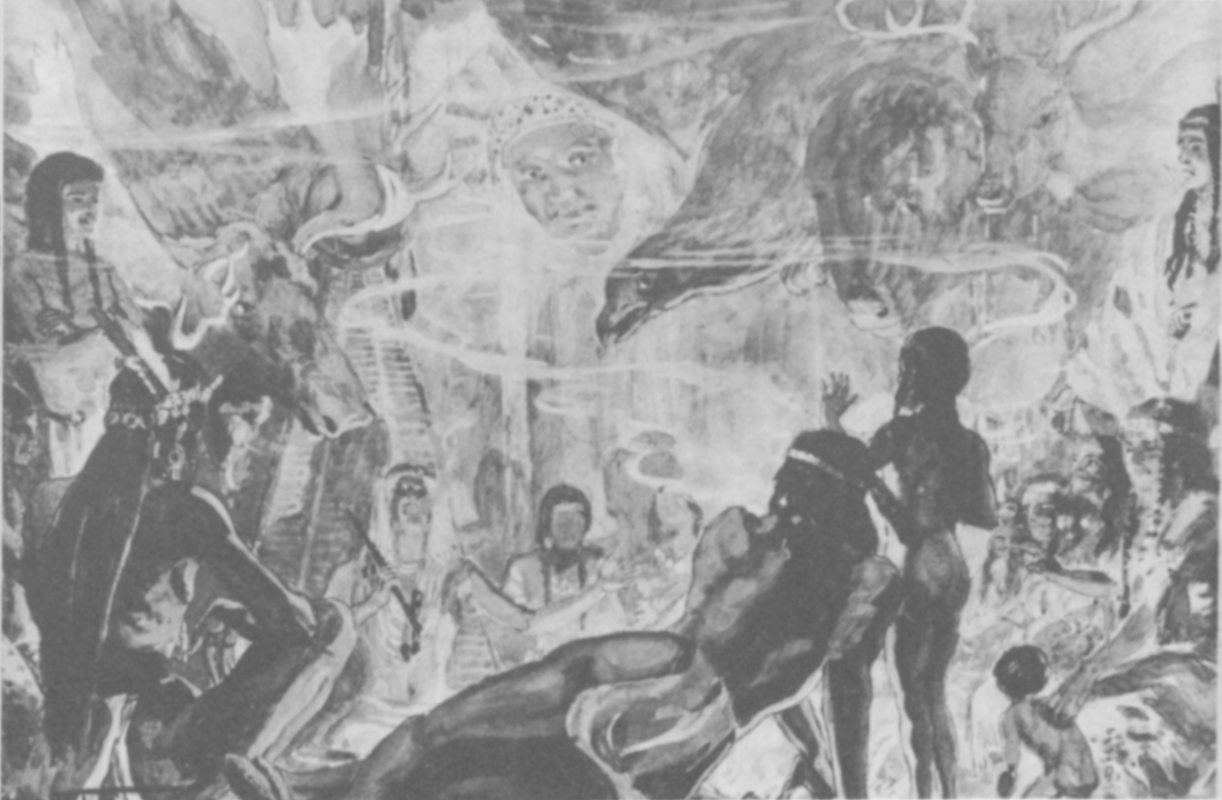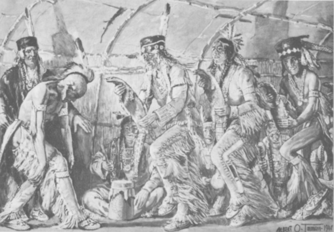MENOMINI INDIAN MEDICINE LODGE CEREMONY (PAINTING BY A. O. TIEMANN).