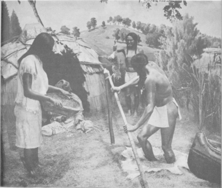 Autumn, the time for harvesting garden crops as well as various wild vegetable foods, is a season of hard work for all. Corn is the most important garden crop, and from time to time we have sampled the ripe grain. The women have served us some roasted on the cob, or the fresh kernels ground with a wooden mortar and pestle and served as a sort of porridge. The ripe corn is now gathered and the ears will be allowed to dry. The dried kernels can then be ground into a meal, as needed, since the dry corn will remain edible for a long time.
