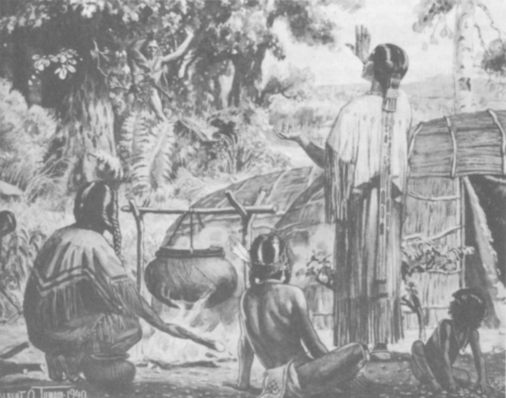 Let’s pretend that we can travel backwards in time about 350 years and visit a typical Indian family of that period. As we arrive on the scene the tribe is preparing to set up a new camp. The women are busy unpacking their household gear, including reed mats used to cover the outer sides of the wigwam. The women themselves have carried the loads during the journey. This is not done because of any laziness on the part of the men, a common error of white observers, but simply because the men need their hands free to ward off a sudden enemy attack, or to kill any game they might chance upon during the journey.