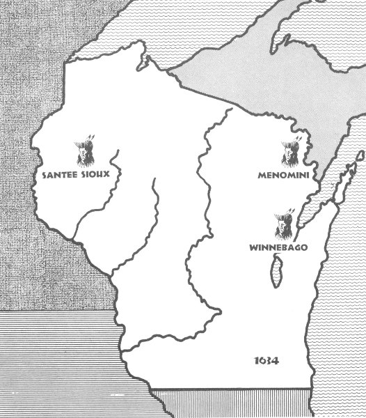 Only three Indian tribes are definitely known to have been residents of Wisconsin when Nicolet visited here in 1634. These were the Winnebago; the Menomini, who resided along the shores of the Menominee River above Green Bay; and the Santee Sioux, whose villages were scattered along the upper reaches of the Mississippi River in northwestern Wisconsin and eastern Minnesota.
