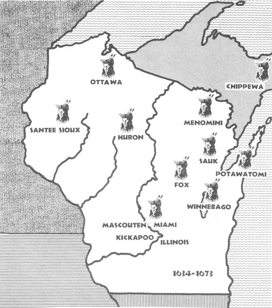 The exact dates for the arrival of these various dispossessed eastern tribes are not certain. We do know that they probably came to Wisconsin sometime after Nicolet’s visit in 1634. The Mascouten, Potawatomi, Kickapoo, Sauk, and Fox were coming into Wisconsin before 1654. Some Huron and Ottawa settled here temporarily at this time, but by 1678 were compelled by the Sioux to flee back to the Sault. The Chippewa stayed around and west of the Straits of Mackinac and actually did not settle in Wisconsin until about 1670.