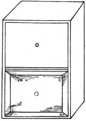 The Handkerchief Cabinet.—This very useful piece of apparatus should be in the repertoire of every amateur magician, as it is available for producing, changing, or vanishing a handkerchief. Its secret lies in the fact that it contains two drawers, bottom to bottom, the lower one being hidden by a sliding panel. When standing on the table the top drawer only is visible, and the cabinet looks the picture of innocence, but if turned over and stood on its opposite end, the sliding panel falls, exposing the hidden drawer, and hiding that which for the time being is at the bottom. (Fig. 12.) The cabinet is about two inches square by four inches high.