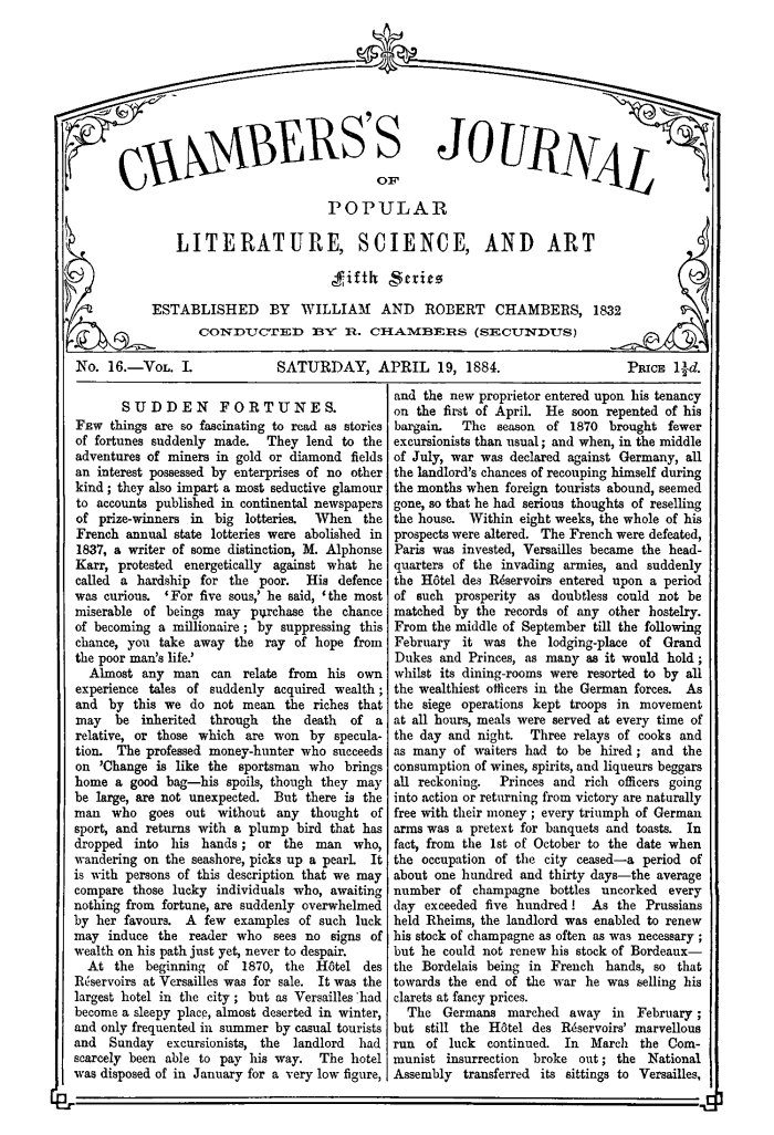 Almost any man can relate from his own experience tales of suddenly acquired wealth; and by this we do not mean the riches that may be inherited through the death of a relative, or those which are won by speculation. The professed money-hunter who succeeds on ’Change is like the sportsman who brings home a good bag—his spoils, though they may be large, are not unexpected. But there is the man who goes out without any thought of sport, and returns with a plump bird that has dropped into his hands; or the man who, wandering on the seashore, picks up a pearl. It is with persons of this description that we may compare those lucky individuals who, awaiting nothing from fortune, are suddenly overwhelmed by her favours. A few examples of such luck may induce the reader who sees no signs of wealth on his path just yet, never to despair.
