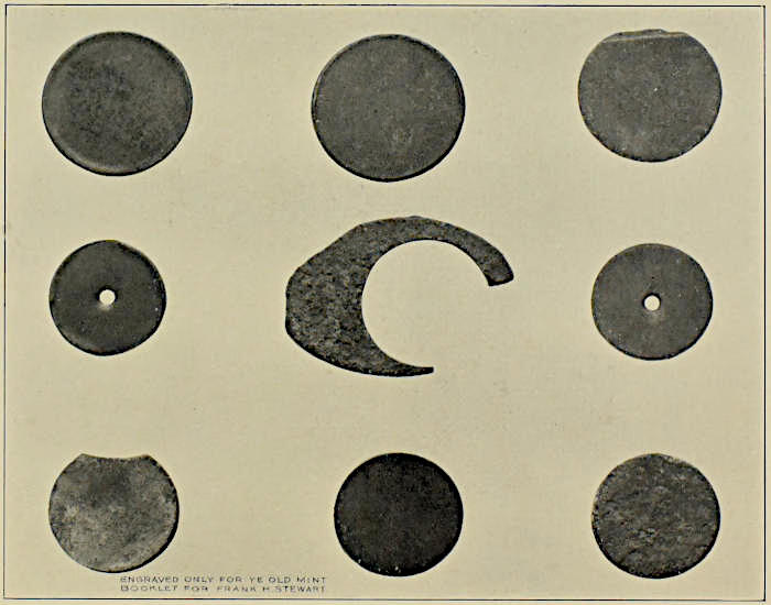 It is interesting to note that in the excavations on the site of the old building, several copper coins and planchets were found, most of which are illustrated opposite page 20. Two worthy of mention are about the size of half-cents, but with[8] small holes in the centre, one of them having a milled edge, the other a plain edge. They are supposed to be planchets for the excessively rare 1792 silver centre cents, which must certainly have been struck off at the mint, otherwise the planchets would not have been found there. The author now has these finds in his possession, as well as a collection of hand forged hardware taken off the old building.