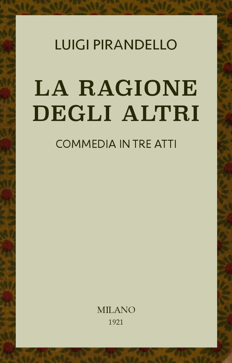 Può una prima attrice di ruolo che si rispetti tollerare una cosa simile, massimamente quando sulla scena resta invece quell’altra, l’amante di vostro marito, che ha una bella parte facile e di sicuro effetto: la parte d’una madre a cui voi, cara signora, avreste voluto togliere la figliuola; una povera madre che se la lascia poi portar via da vostro marito, la figliuola, alla fine, e resta lì, sola sulla scena, davanti al giocattolo della bimba che non c’è più: quella campagnina stesa sulla tavola, con gli alberetti e le pecorelle e il pastore e il cane; e che poi s’accorge d’aver tra le mani il cappellino di lei e rompe in singhiozzi disperati e cala la tela?