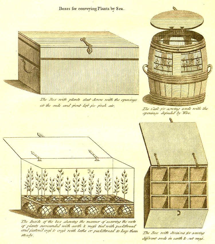 [71] “The carrying of trees cannot be done, with any hope of success, except in boxes, wherein they may vegetate during the voyage. For this purpose it is necessary to have a box forty inches long by twenty broad, and as much in depth, with a dozen holes bored through the bottom, for the superabundant water to run off. Its upper part must be composed of a triangular frame, upon which lattice work of iron wire must be fitted, with glazed frames and window shutters, to keep up a free circulation of air, encrease the warmth when necessary, and keep out the cold.” Pèrouse’s Voyage, Vol. I. p. 283.