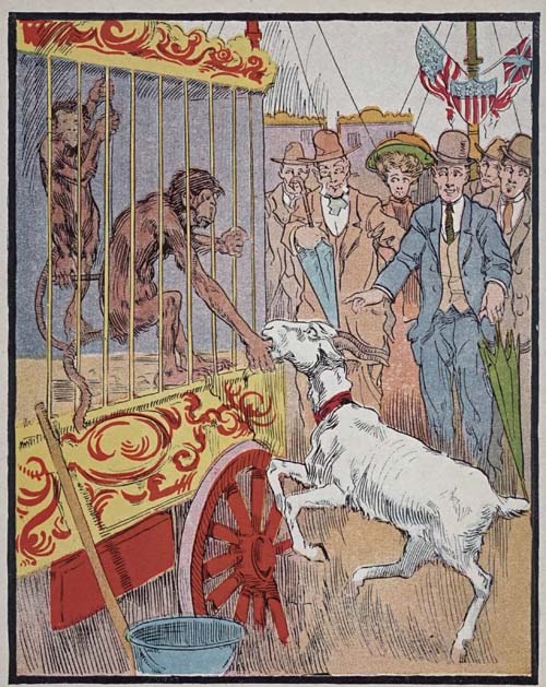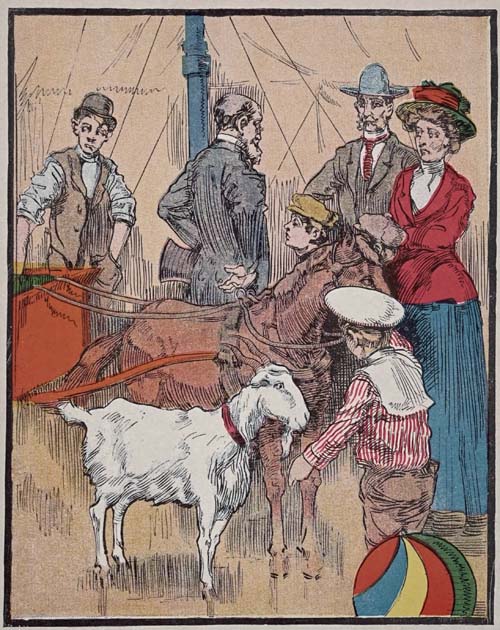 So things were moving smoothly with Billy Whiskers and he had no thought of not spending the rest of his life with the Treat family, when one June day he heard Tom Treat ask Jack Wright, his playmate and chum, if he were going to the Circus that was coming to Springfield the next week. Jack said that he had not heard about it. Tom, who had just returned from The Corners where he had gone on an errand for his mother, then told him about the show bills that some men were putting up on the sides of the post office and blacksmith’s shop. He said that he had waited so long to see them all that he had forgotten all about his errand—he called it his “old errand”—that his mother was waiting for the baking powder and that he had caught “hail Columbia” when he finally got home.