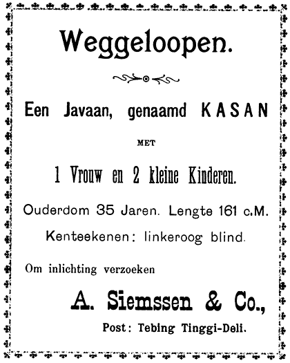 Bovendien wordt de Javaan, hier op de Oostkust aangekomen, geenszins slaaf. Het tegendeel is waar. De Javaan is op Java veel meer een slaaf, dan de contract-koelie hier op de kust. De koelie neemt eenvoudig een verplichting tot arbeid op zich volgens contract en over het algemeen worden de contract-koelies goed behandeld. Hoe gaat het echter met den Javaan op Java? Op Java worden zij gesneden, de loerah’s, de assistent-wedono’s, ook de planters straffen den Javaanschen arbeider op Java. Indien hij iets op zijn kerfstok heeft, krijgt hij met den rotan en is hij over de hem toebedeelde straf niet tevreden, wel, dan marcheert hij naar den controleur, dat wil zeggen, den wedono. Deze vraagt hem, waarom hij ontevreden is? Het is toch beter een 20 rotanslagen te ontvangen, dan in de gevangenis te gaan en berri-berri op te loopen.