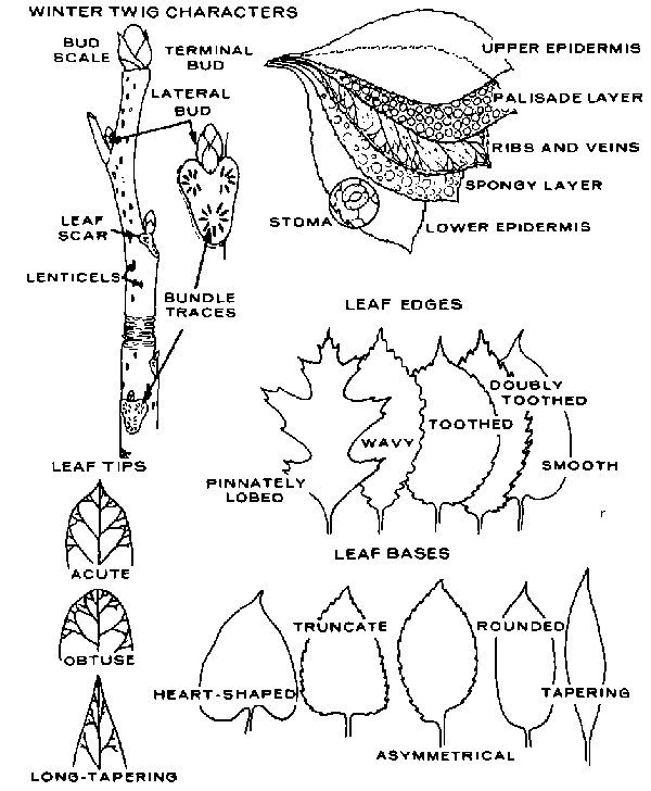 In order to distinguish one kind of tree from another, it is necessary to learn the major characteristics which the forest trees of Illinois may possess. Illustrated below are several of the most commonly encountered characteristics of leaves and twigs. A thorough understanding of these structures will insure a quicker and more accurate identification.