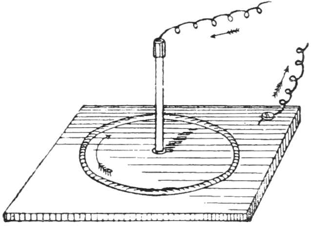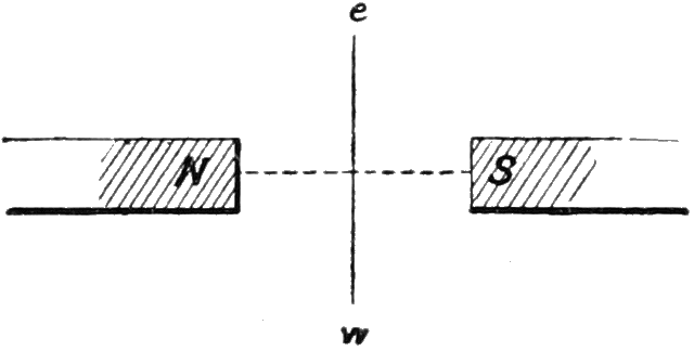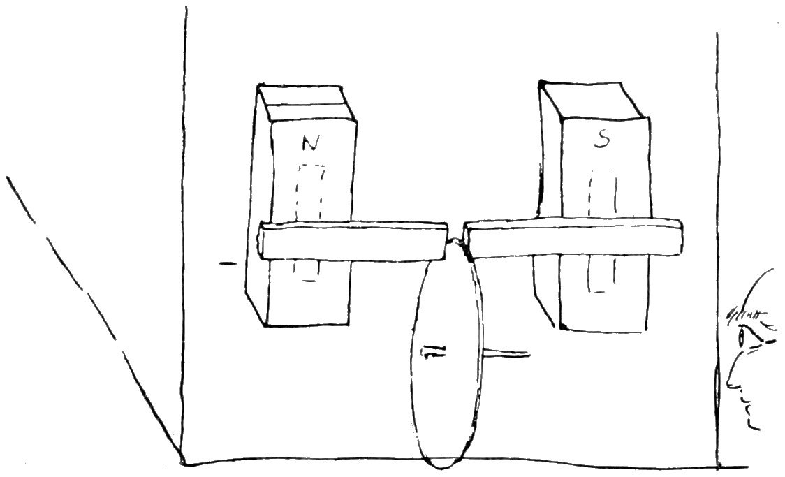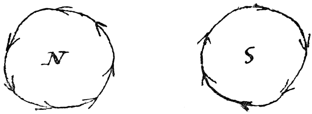 “From the preceding facts we may likewise collect that this conflict performs circles; for without this condition, it seems impossible that the one part of the uniting wire, when placed below the magnetic pole, should drive it towards the east, and when placed above it towards the west; for it is the nature of a circle that the motions in opposite parts should have an opposite direction.”—H. C. Oersted, Ann. of Phil., Oct., 1820, pp. 273–276.
