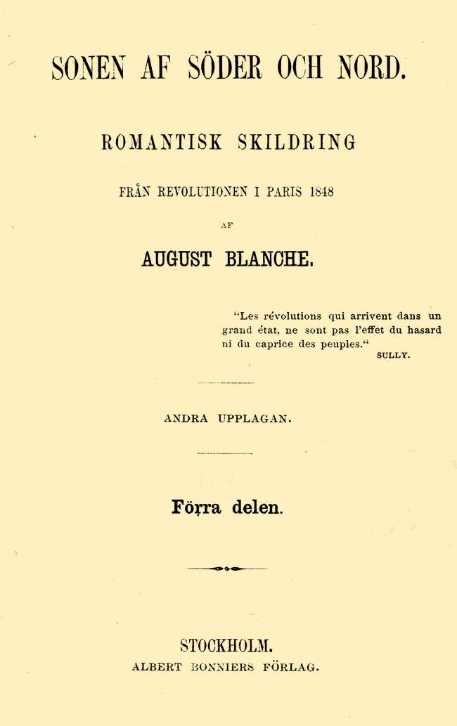 Mitt förra beslut trogen, har jag i samma roman inflikat beskrifningar och reflexioner öfver åtskilliga märkvärdigheter inom den stora staden samt derjemte sökt teckna den sednaste revolutionen, hvarvid jag icke allenast begagnat mig af de underrättelser, som man genom personlig beröring med fransmän af alla opinioner kan inhemta, utan äfven studerat från trycket utgifna skildringar öfver de märkvärdiga dagarnes händelser. Företrädesvis har jag följt ett arbete, utgifvet af den frejdade Alexandre Dumas, mera känd såsom orleanist än såsom republikan, kalladt: