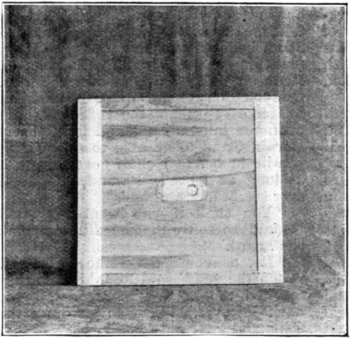 The super-clearer is placed between the super and the stock-box. If the weather is warm it will be found that in about twenty-four hours’ time not a bee will be left in the super, and it may then be removed and{724} brought indoors. In colder weather the super-clearer may take two days or more to do its work. It should not be left on the hive after the super has been taken away, but must be removed with a little smoke, its place over the frames being taken by the quilts.