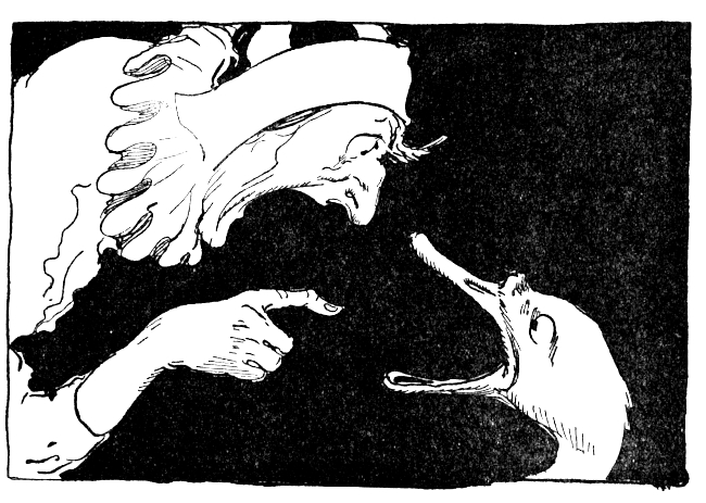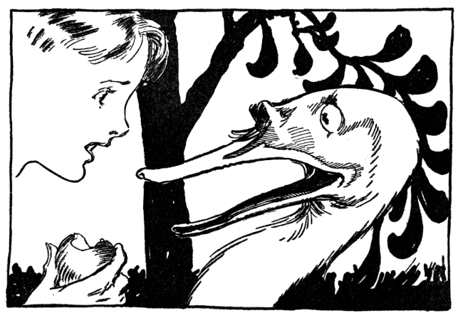 "Help!" squawked the luckless bird, as Mombi seized it roughly by the feathers. Then, catching a really good look at Mombi, it reared up its neck till its eyes were on a level with her own. "YOU!" cried the goose, so shrilly that Snip's hair rose up and waved to and fro under his stiff little hat. He was not surprised to hear the goose talk, for all beasts and birds in the Land of Oz converse, but its next words were so strange and mysterious the little button boy nearly lost his balance again.