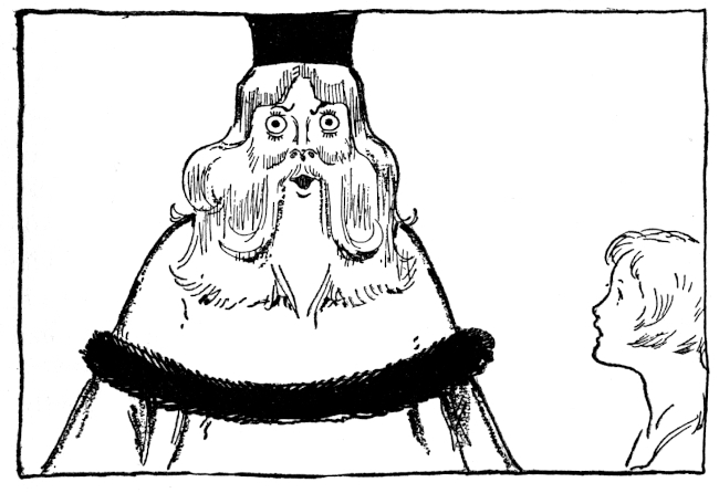 "Find the man who fits the King's robe," cried Tora, waving his tape measure. "Try him," he finished, indicating Sir Hokus of Pokes.