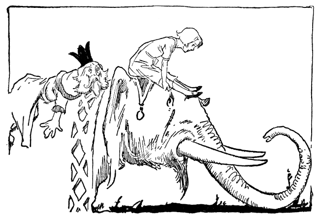 "I'll take you back," volunteered Kabumpo carelessly. "It's on my way home anyhow." The Elegant Elephant was also anxious to be off and acquaint the court of Pumperdink with the important events that had transpired. He wished to display the emerald head-piece Ozma had given him, and dazzle the courtiers with the silver robe bestowed upon him by the kingly tailor of Oz. So after a quick luncheon, a quick exchange of good-byes and good wishes, the pompous old elephant took his departure, carrying on his back brave General Whiffenpuff, the Invisible Cook and the gallant little button boy of Kimbaloo.