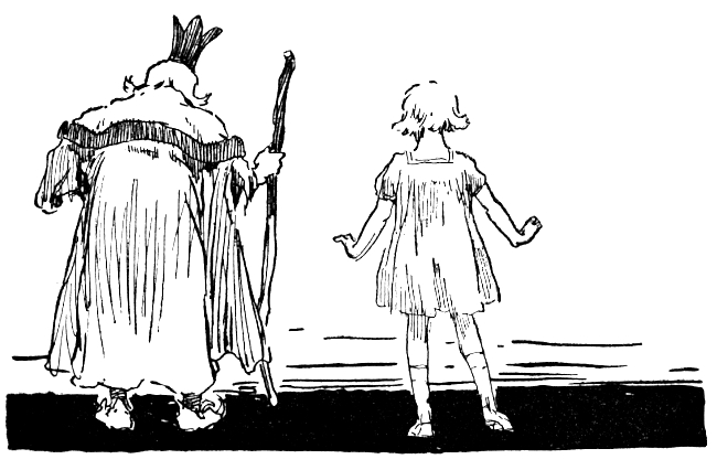 "Pajuka!" cried the tired tailor. Rushing joyously down the steps of the throne, he threw both arms 'round a fat, jolly old gentleman. The tired tailor, did I say? But no! He was the tired tailor no longer! The rounded shoulders had straightened up under the velvet robe, the tired eyes sparkled with pleasure and kindliness. Tora, the tailor, no longer, but Pastoria, the King, stood embracing his prime minister, for the same green formula that had restored his majesty had also released Pajuka from his weary enchantment.