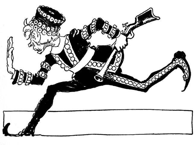 Just as the royal party was trooping into the palace for lunch, a page rushed out to announce a visitor. It was General Whiffenpuff and a loud noise whom he introduced as the Invisible Cook. Travelling night and day, and searching everywhere for Mombi and Snip, he had finally reached the Emerald City and found the famous cook recommended by the Town Laugher of Kimbaloo. His delight at seeing the little button boy safe and sound was only exceeded by his astonishment at Snip's marvelous adventures, but as the cook, for all her invisibility, had a bad habit of treading on the general's toes, he was anxious to return to Kimbaloo and turn her over to Kinda Jolly.