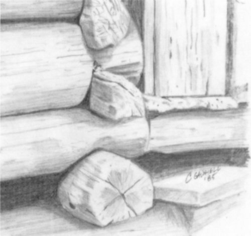 Pictured on this page are examples of log construction. In figure 4 the logs were split; the inner room wall surface would be even. In figure 5 may be seen several elements of folk log house construction in the drawing of a house being dismantled. This dogtrot with open passage between pens had an attached porch, square logs with square notches, an end exterior chimney (base visible), three inch round pole roof rafters and gallery door openings with the head occurring at the seventh log. In figure 6 a close-up detail shows the square hewn logs and square notches on this dogtrot.