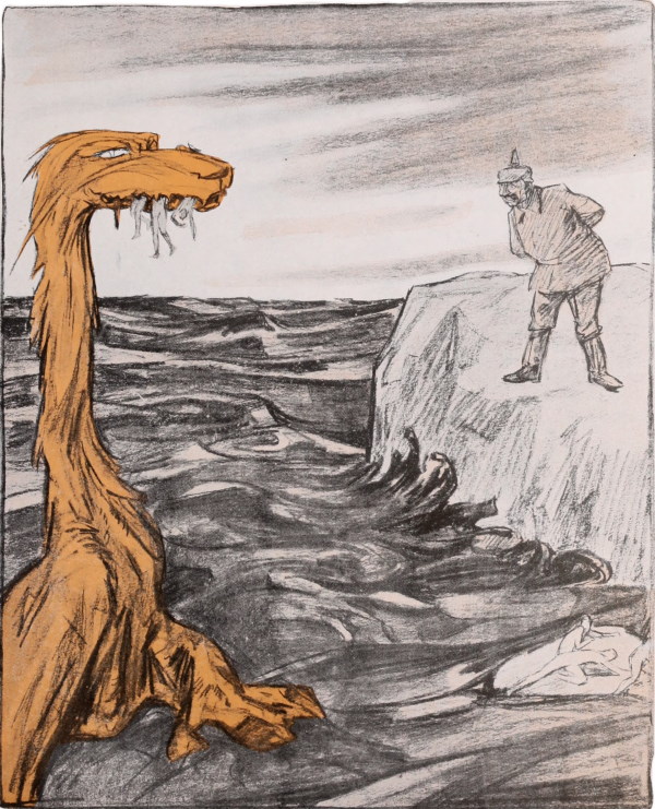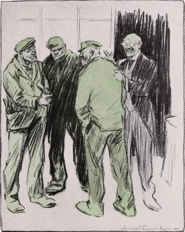 You see Raemaekers knows both Kaiser and workingmen, and so will have nothing to do with the conventional portraits of either. The Kaiser is neither a beast nor a fool—however foolish his position may be. The workingmen are neither labor heroes ready to revolt, nor conscious and beaten serfs.