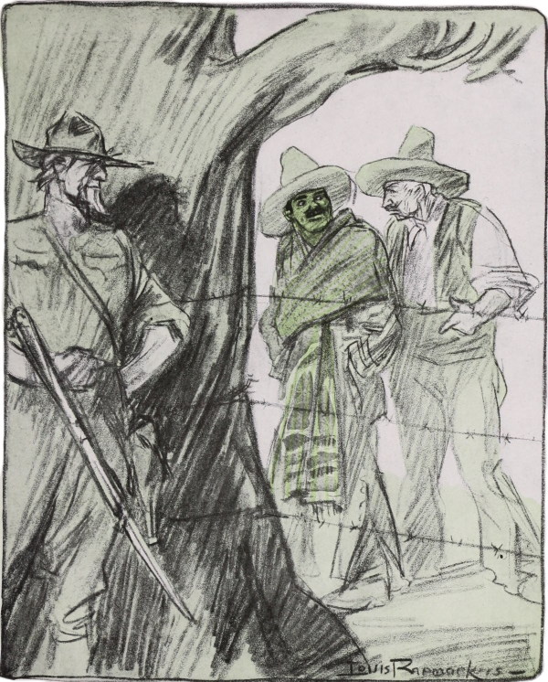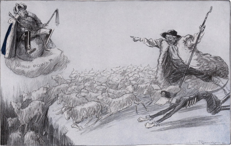 So much for the picture—at second glance. It leads to an endless chain of reflections. But the first and most obvious is on the sort of burden these men are carrying. Here is an accepted ruler who is allowed to monopolize the force of the nation, as the cartoon clearly indicates. This of itself gives him an absolute and unlimited power over his workers. The only possible alternative use of that force is to make slaves of the workers of other nations. The German workingmen, it is suggested, lend themselves blindly to this work of enslavement also—naturally, for it is no different for their Kaiser to rule by force and lies over non-Germans than to rule by force and lies over Germans. The face of the Kaiser shows a subconscious realization of these lies. The workers show utter unconsciousness. The rule of autocracy over themselves and the extension of that autocracy over others by means of their blood is to them as much a part of nature as the motions of sun and moon or the rise and fall of the tides!