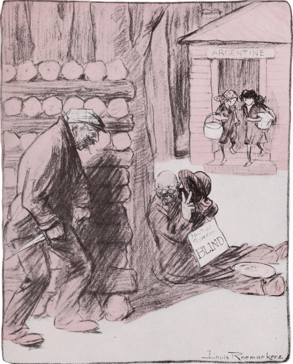 The failure is only at first glance. Raemaekers is not concerned to reproduce the conventional cartoon of workingmen carrying a burden of other classes on their shoulders. The point lies not in the burden, but in the nature of the burden, the contrast, so perfectly portrayed, between the character of the Kaiser and the characters of his proud and willing slaves. The Kaiser, crafty and contemptuous, but neither so ignorant nor so stupid as to be wholly unconscious of the foolish and contemptible position he occupies! The workingmen evidently once strong, intelligent and enthusiastic, though now blinded and crippled, are utterly unconscious of what they are doing. Carrying the heavy burden of Kaiserism seems no more to them than their day’s work.
