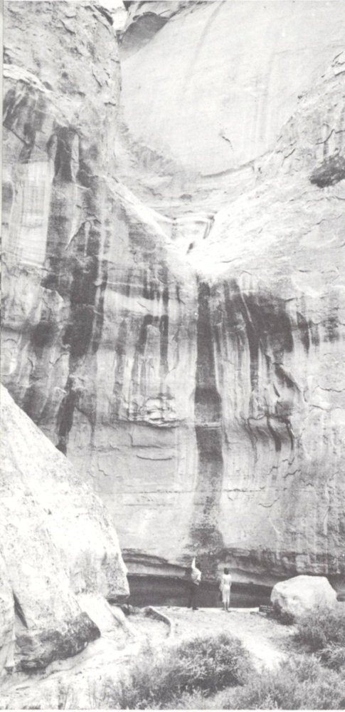 If you look closely at the rock, about 12 feet above the ground, you will see some notches cut into the sandstone. These are footholds. Probably most Indians came to the pool by the long, safe way, but others, caring more for their thirst than their lives, came down from the mesa top through the high notch to the right and above you.