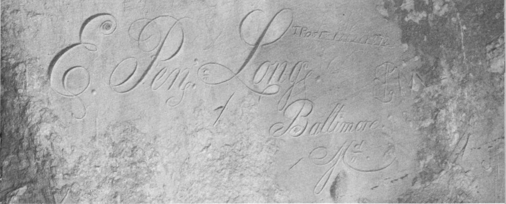 The signature of Mr. Long is the most impressive one on the rock. It appears to have been carved between 1850 and 1862, probably with a knife after being sketched. Just to your right around the corner, note “Mr. Engle” in block print and “Mr. Bryn” in script. Engle was Beale’s second-in-command and Long and Bryn were members of Beale’s company.
