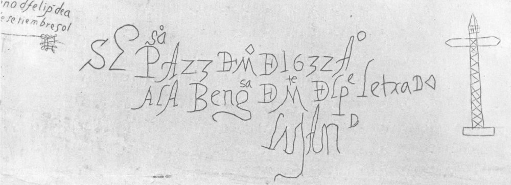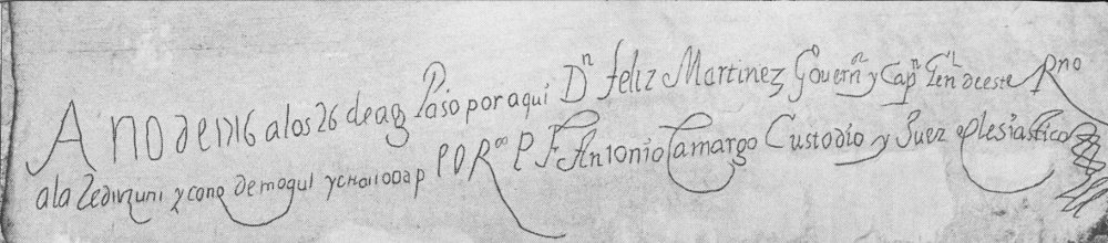 “Year of 1716 on the 26th of August passed by here Don Feliz Martinez, Governor and Captain General of this realm to the reduction and conquest of the Moqui 7 (Hopi) and (in his company?) the reverend Father Friar Antonio Camargo, Custodian and ecclesiastical judge.”