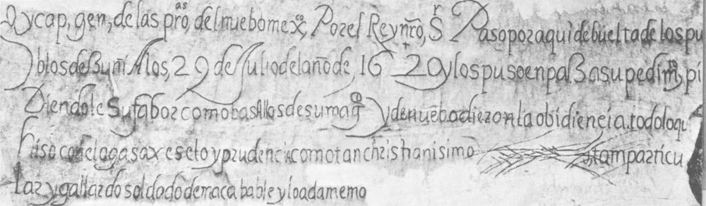 “I am the captain General of the Providence of New Mexico for the King our Lord, passed by here on the return from the pueblos of Zuñi on the 29th of July the year 1620, and put them at peace at their humble petition, they asking favor as vassals of his Majesty and promising anew their obedience, all of which he did, with clemency, zeal, and prudence, as a most Christian-like (gentleman) extraordinary and gallant soldier of enduring and praised memory.”