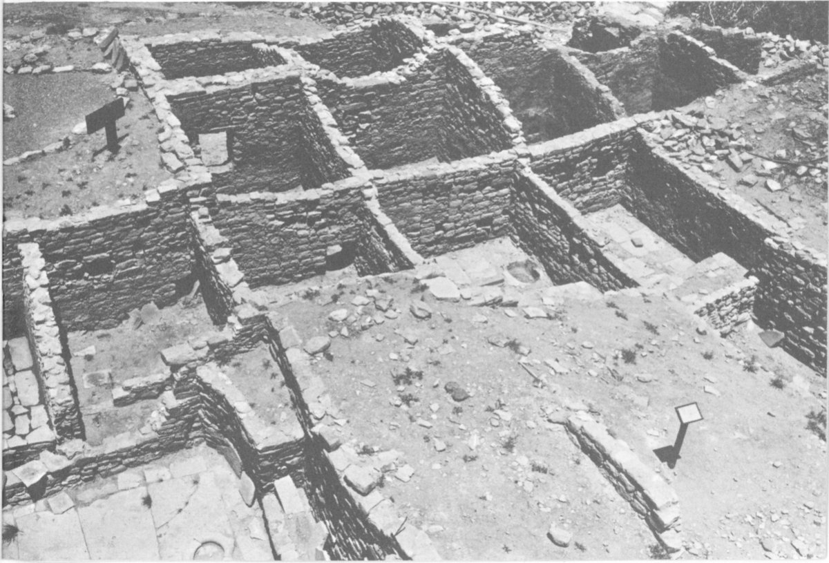 Atsinna, the larger of the two ruins, is approximately 200 by 300 feet, the size of some city blocks. Like the other village, parts of it probably were three stories high, mainly along the north side. It was terraced down toward the south, thus providing a southern exposure. You are standing on the second floor level about ten feet above the original ground level. The first floor was filled with debris from the collapse of the upper stories.
