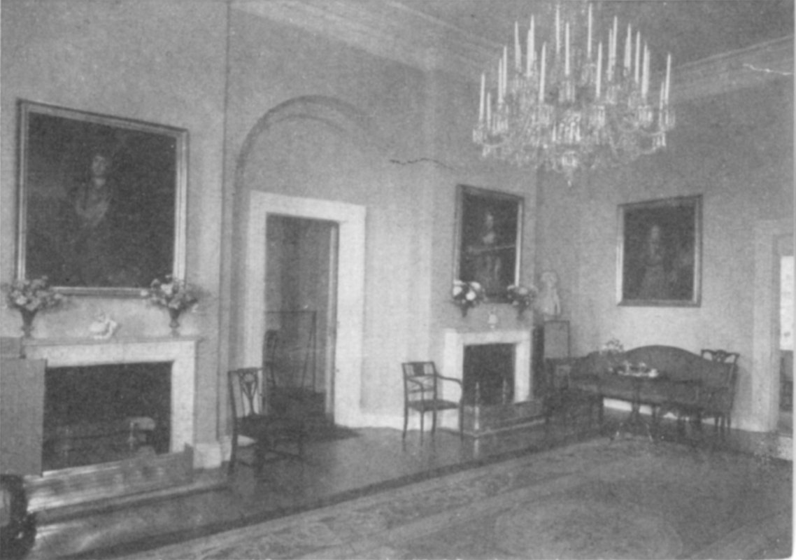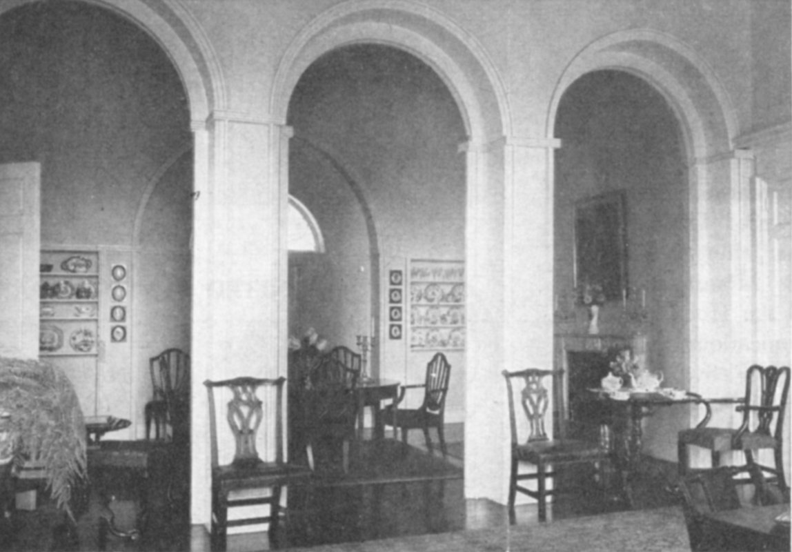 The extent of the front of the Mansion, with its two wings, is 140 feet. The wings are identical, except that in the north wing the space corresponding to the state dining room in the south wing was divided into small rooms for the temporary accommodation of Mr. and Mrs. Custis while the house was being built and was never changed. The central portion is divided by a wide central hall. A large formal drawing room with two fine marble fireplaces lies south of this hall, while to the north of it can be seen the family dining room and family parlor separated by a north and south partition broken by three graceful arches. The second story is also divided by a central hall on either side of which there are two bedrooms and accompanying dressing rooms. A small room used as a linen closet is at the end of this hall. The third floor was used only for storage purposes and remained an unfinished attic. The grand portico facing the Potomac, with its eight massive Doric columns, was modeled after the Temple of Theseus at Athens. At the rear, two outhouses used as servants’ quarters, smokehouse, workroom, and summer kitchen form a courtyard.