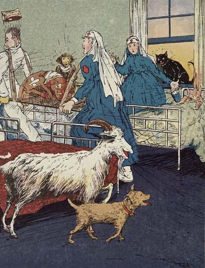 But when the dogs arrived within speaking distance they were overjoyed to hear the goat baa out, “Hello, old chum! How in all that is wonderful did you get here? I heard you were dead; that you had been seen with a Red Cross ambulance which had first been gassed and then blown up by a shell. One of your friends said he saw you with his own eyes sitting in the back of the ambulance when[19] the shell struck it, and the next thing he saw was the whole ambulance flying up in the air and then coming down in small pieces.”