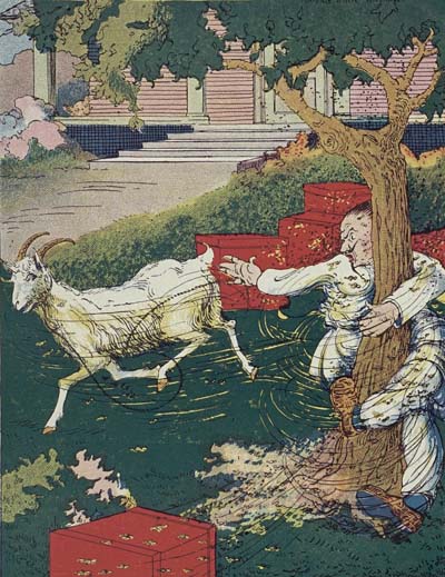 The dogs stood spellbound. What was the big goat going to do? Butt their wounded hero? If so, why should he wish to butt a perfectly harmless dog he had never seen before? But had he never seen him before? Perhaps they had met and fought on the battlefield and were enemies. If so, they must all run and protect their hero from the long horns of the strange goat.
