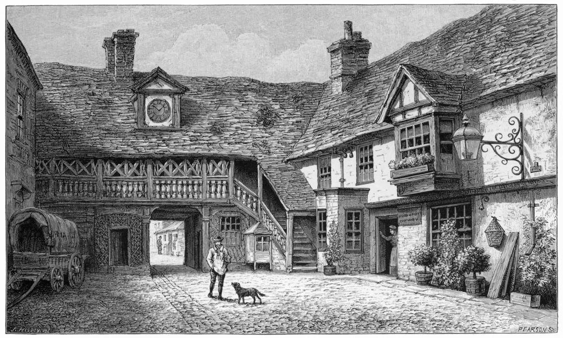 Arriving at Barnet, we pulled up at the “Red Lion,” and rested there to bait our horses. The sign of the inn—perhaps the most popular of all English signs—was not painted on a board and upheld by a post, as so frequently obtains in old-fashioned hostelries such as this; but the lion was carved in wood, and skilfully carved too, whilst to add to his dignity we found him rejoicing in a fresh coat of vermilion, and still further to attract the wayfarer’s attention he was supported upon a wrought-iron bracket that projected right over the pavement. This sign, standing thus boldly aloft on its great bracket, was a point of interest in the everyday street for the eye to dwell upon—an interest emphasised by past-time associations, for thus, before the coming of the iron horse, had it greeted our inn-loving forefathers when journeying this way, and in a pleasantly defiant manner bade them stop and{14} take their ease; not that they needed much pressing to do so, for did not the worthy Dr. Johnson, when posting across country, frequently exclaim, “Here is an inn; let us rest awhile”? But that was in the leisurely days gone by when mortals had more time to call their own. I have often wondered, could he be conjured back to life again, what the worthy doctor would think of present-time ways, what he would say of the railways, but above all, what his opinion would be of the huge company hotel, where he would find his individuality merged in a mere number. I trow he would prefer his comfortable tavern, where he could have his quiet talk—and listeners.