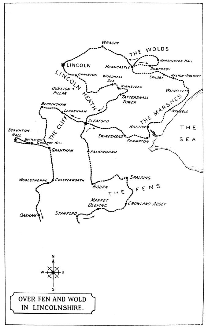 “What a night for any one to be out,” I muttered, as I took the proffered letter, glancing first at the handwriting, which was unfamiliar, then at the postmark, which bore the name of a remote Lincolnshire town, yet we knew no one in that whole wide county. Who could the sender be? we queried. He proved to be an unknown friend, who in a good-natured mood had written to suggest, in case we should be at a loss for a fresh country to explore during the coming summer, that we should try Lincolnshire; he further went on to remark, lest we should labour under the popular and mistaken impression (which we did) that it was a land more or less given over to “flats, fens and fogs,” that he had visitors from London staying with him with their bicycles, who complained loudly of the hills in his neighbourhood; furthermore, “just to whet our appetites,” as he put it, there followed a tempting list, “by way of sample,” of some of the good things scenic, antiquarian, and archæological, that awaited us, should we only come. Amongst the number—to enumerate only a few in chance order, and leaving out Lincoln and its cathedral—there were Crowland’s ruined abbey, set away in the heart of the Fens; numerous old churches, that by virtue of their{6} remoteness had the rare good fortune to have escaped the restorer’s hands, and not a few of these, we were given to understand, contained curious brasses and interesting tombs of knightly warriors and unremembered worthies; Tattershall Castle, a glorious old pile, one of the finest structures of the kind in the kingdom; the historic town of Boston, with its famous fane and “stump” and Dutch-like waterways; Stamford, erst the rival of Oxford and Cambridge, with its Jacobean buildings, crumbling colleges, and quaint “Callises” or hospitals; Grantham, with its wonderful church spire and genuine medieval hostelry, dating back to the fifteenth century, that still offers entertainment to the latter-day pilgrim, and, moreover, makes him “comfortable exceedingly”; besides many an old coaching inn wherein to take our ease; not to mention the picturesque villages and sleepy market-towns, all innocent of the hand of the modern builder, nor the rambling manor-houses with their unwritten histories, the many moated granges with their unrecorded traditions, and perhaps not least, two really haunted houses, possessing well-established ghosts.