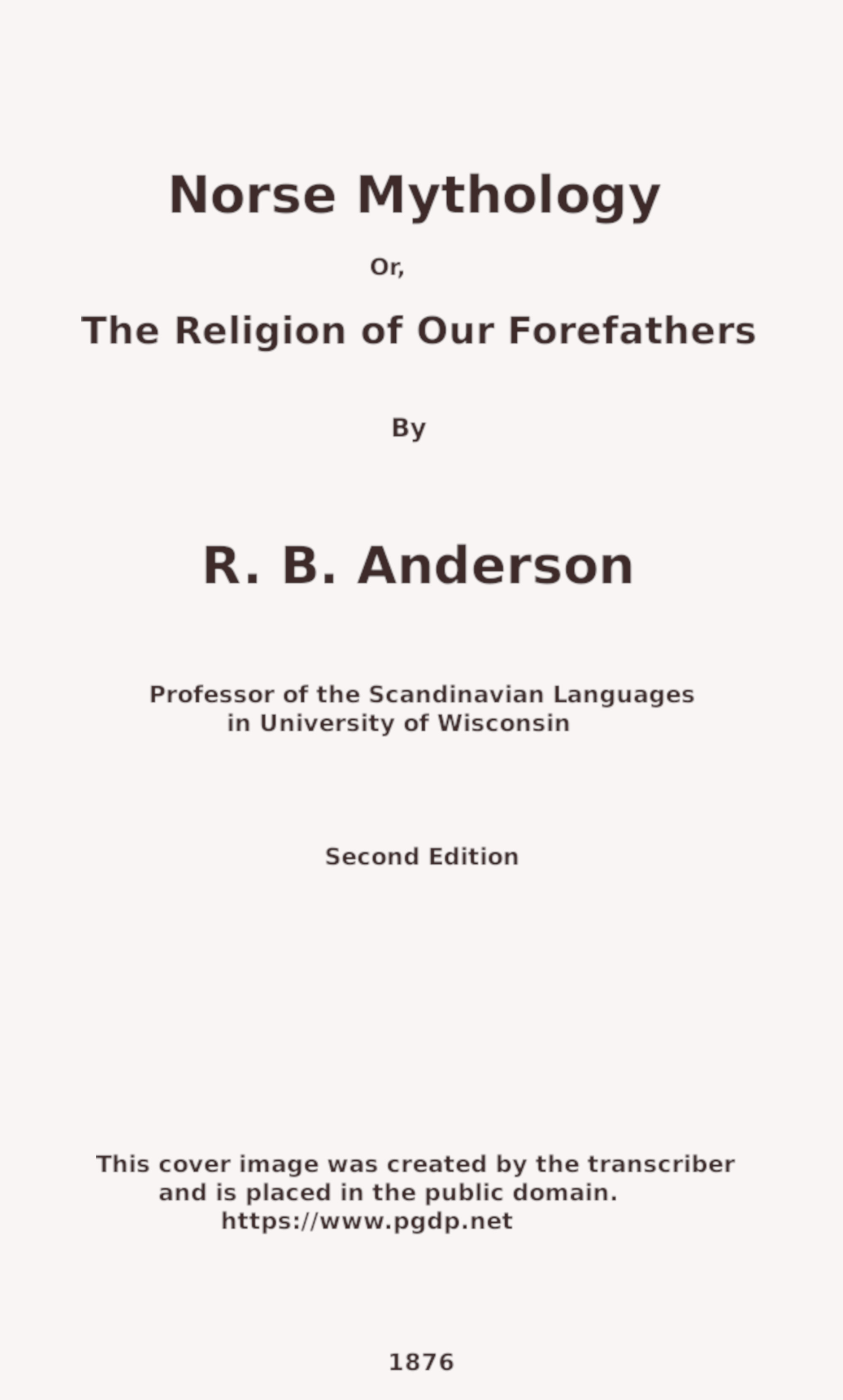 Of the Elder Edda we have used Benjamin Thorpe’s translation and Sophus Bugge’s edition of the original. It has been found necessary to make a few alterations in Thorpe’s translation. Of the Younger Edda we have used Dasent’s translation and Sveinbjorn Egilsson’s edition of the original. Of modern Scandinavian writers we have confined ourselves mainly to N. M. Petersen, N. F. S. Grundtvig, P. A. Munch, Rudolph Keyser, Finn Magnússon, and Christian Winther. Other authors borrowed from more or less are: H. W. Longfellow, H. G. Möller, R. Nyerup, E. G. Geier, M. Hammerich, F. J. Mone, Jacob Grimm, Thomas Keightly, Thomas Carlyle, Max Müller, and Geo. W. Cox.