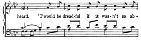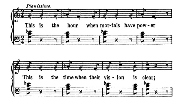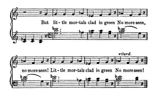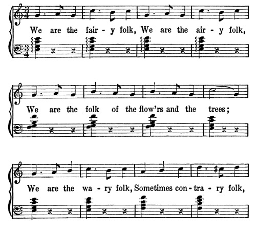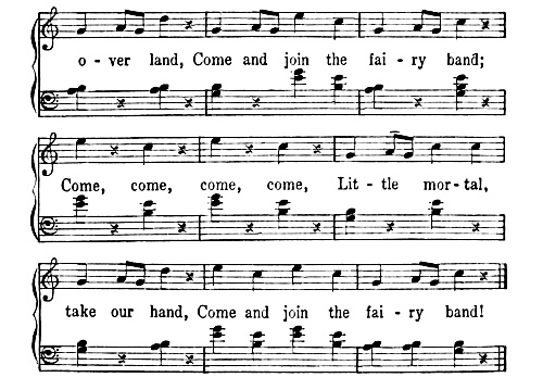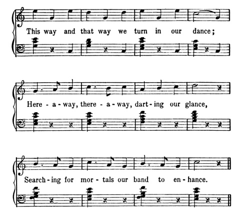 [They nod and finally doze, sinking into a reclining position upon the mound. The Fairies and Elves steal out cautiously, to soft music, and survey the children with curiosity. Then, coming closer, they surround the sleepers and sing; air, “Der Rothe Sarafan.”]