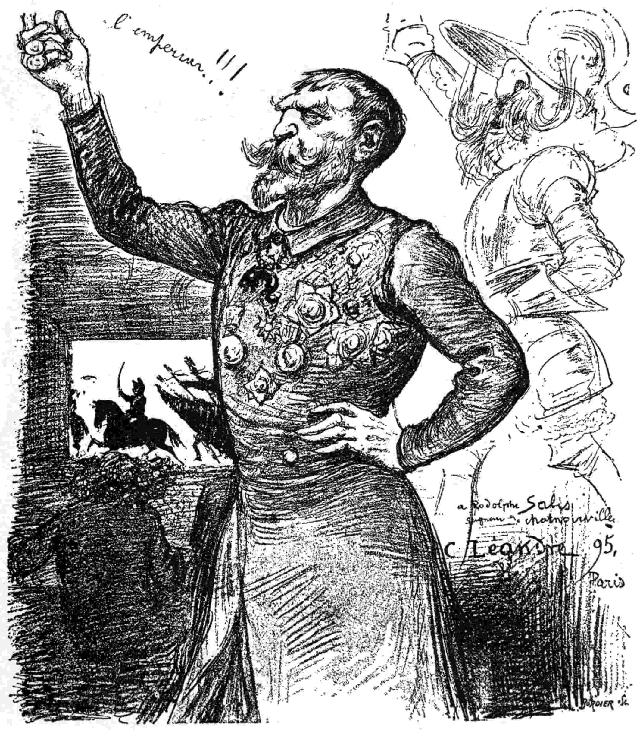 Léandre has frequently introduced a self-portrait into his sketches, and he is evidently as critical of himself as of others. He always shows us a serio-comic little man with chubby cheeks, bulging, spectacled eyes, and a big inquisitive nose dominating a small turned-up moustache and starveling beard. Some of his own military service adventures he has depicted for us in mock heroic style in “Les Treize Jours de Léandre.” Among notable caricature portraits is that of Drumont, the arch Jew-baiter. In a coloured drawing entitled “The Ogre’s Repast,” we see this noisome person with a chain of Semite “portions” round his neck poising a gory80 Jewish head on his fork previous to making a meal of it. In fine irony a cross hangs on his breast.