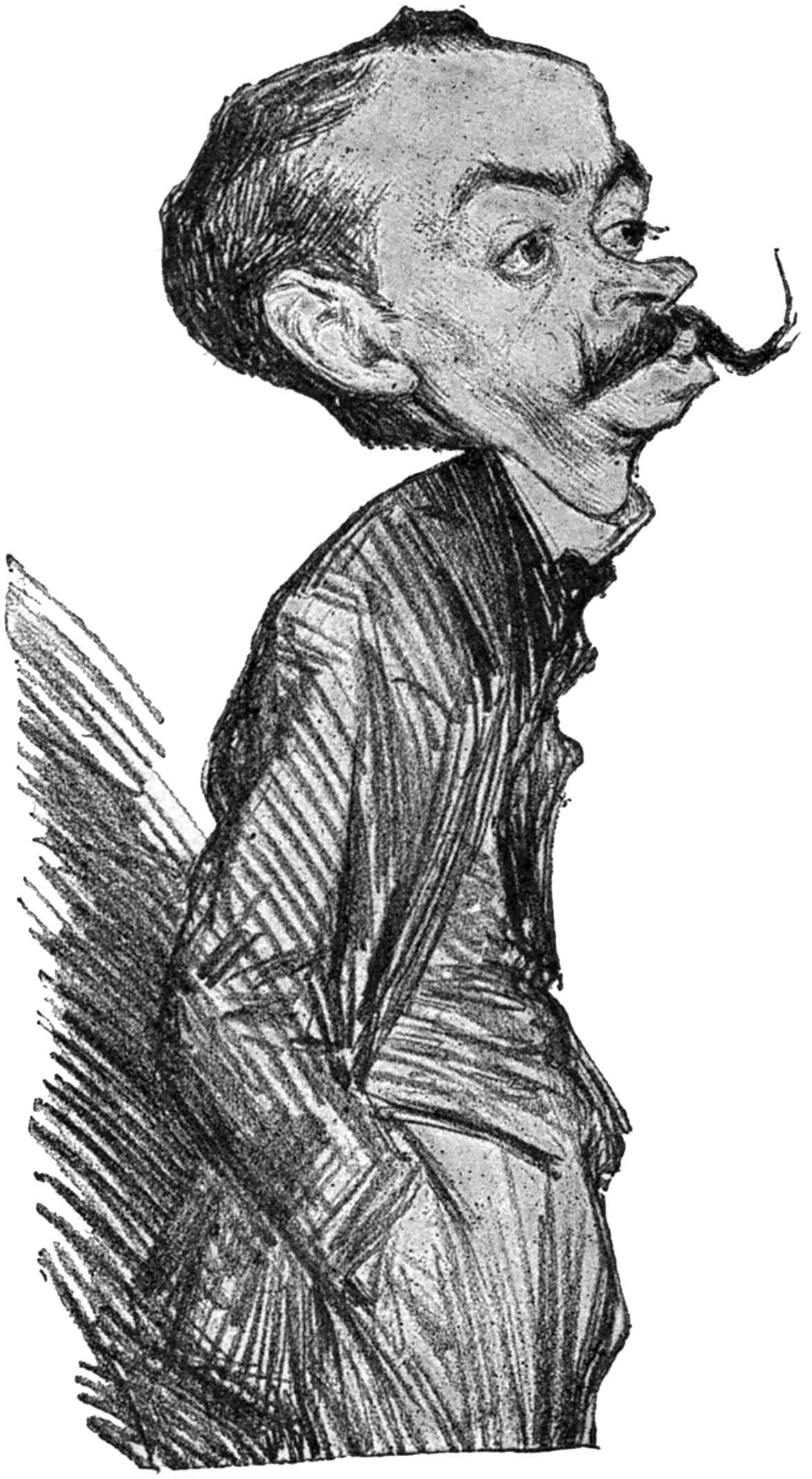 It must not be imagined from the foregoing that portrait caricature alone occupies the pencil of our artist. His book of subtle wash drawings entitled “Nocturnes,” and the lively pages of Le Rire, L’Album, L’Assiette au Beurre, and other journals are embellished with his cartoons and comic drawings, covering a fairly wide range of subjects. He is moreover a serious portrait-painter of great feeling and delicacy. We may look on him almost as an animalier, or natural history artist making a speciality of that droll, brainy, beast—man, recording all his different varieties, and watching his every gesture and movement.