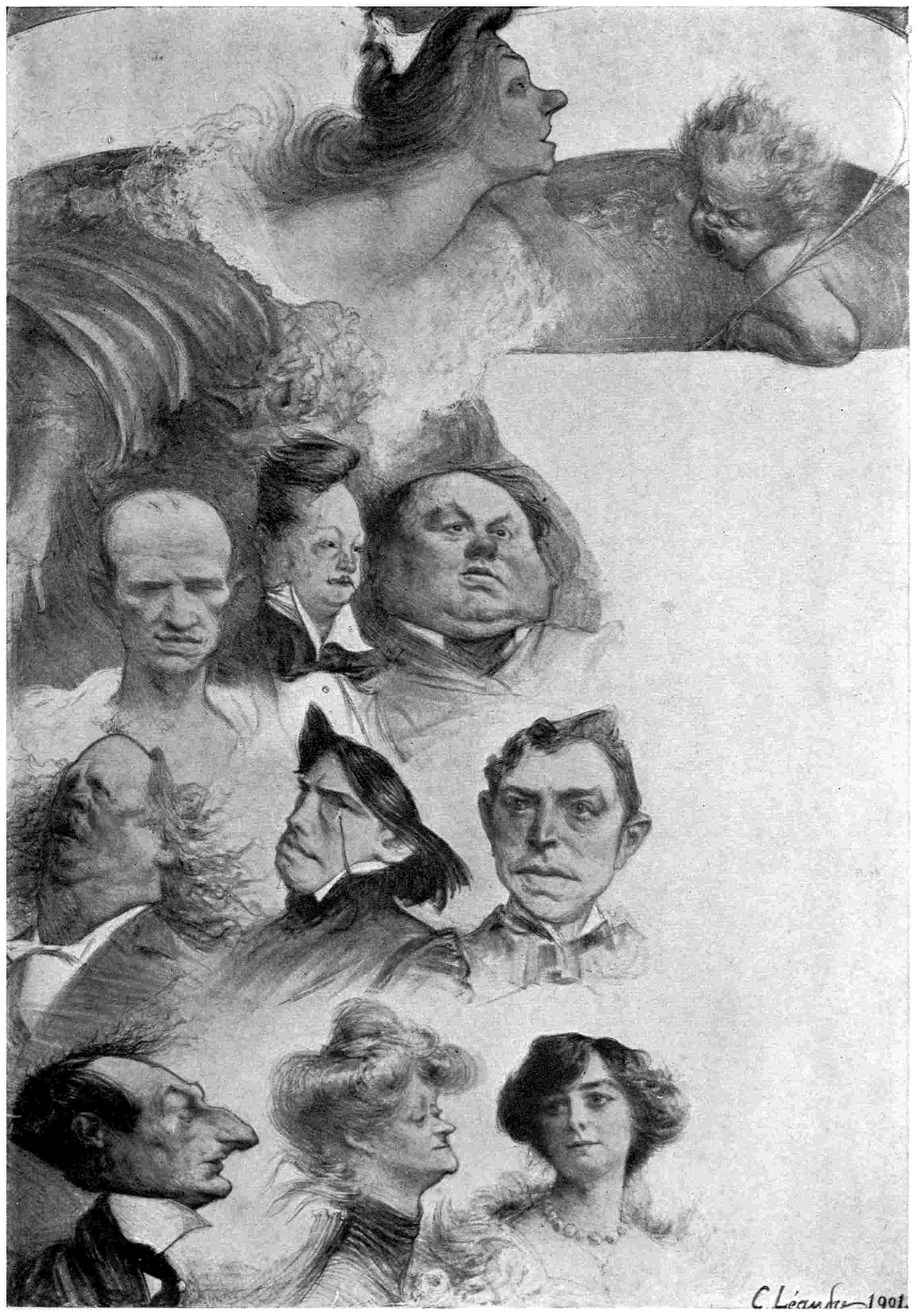 Léandre was born at Champsecret, Orne. It is easy to trace the influence that a course of modelling in plaster under the decorator Bin, which he attended after leaving college and arriving in Paris, impressed on his work, for all his heads have a strong sculpturesque feeling about them. Later he became a pupil of Cabanel at the Beaux Arts School; and we, who know the ways of Paris art students, can well imagine the uproarious series of “charges” or caricatures, he must have painted of his fellow students, and possibly of his professor. For it is certain that later on he handled the gens sérieux, with whom he77 was brought into contact at the reunions given by his uncle—the Deputy Christofle, with but scant regard for their dignity.