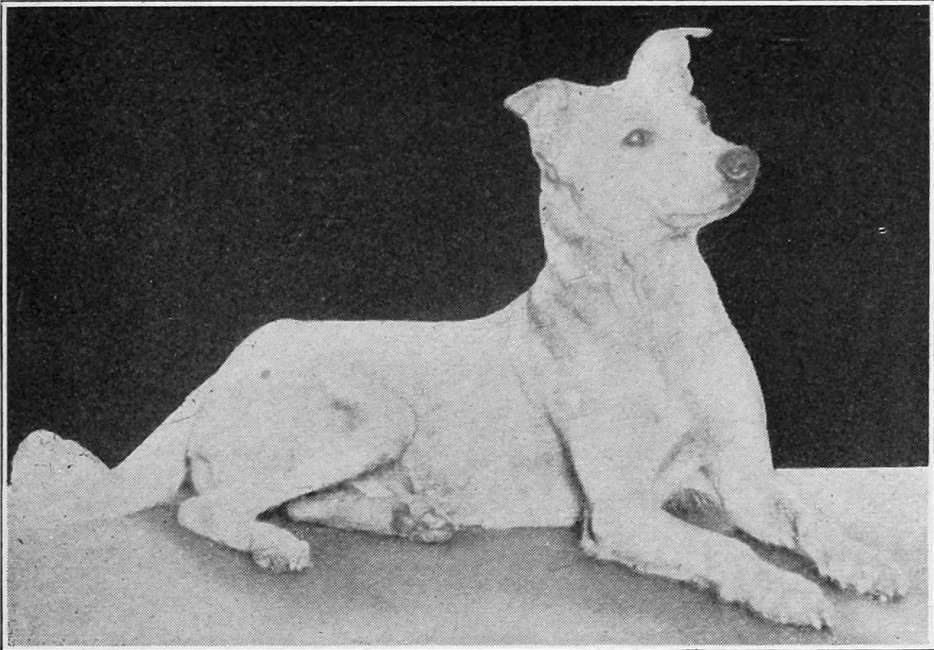 This is Whitey, about eight months after the complete removal of the parathyroid glands. These glands are quite often partly and accidentally removed during operations on the thyroid gland in man, with alarming and sometimes fatal results. Following complete removal of the parathyroid glands, carnivorous animals, including man, die within from four to six days. As a result of experimental work on this dog and other animals, three effective curative measures have been developed, which indefinitely preserve the life of such animals in normal health. Two persons are known to have been saved and several others have been rendered free from symptoms as a result of this study.