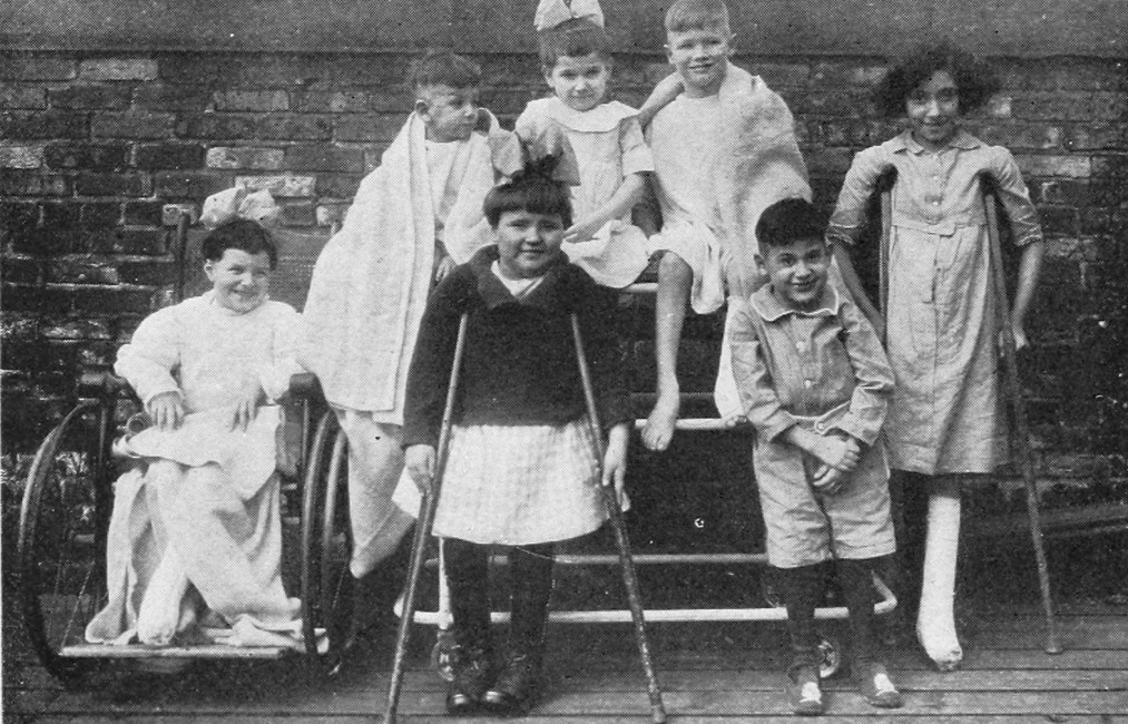 On the roof garden of the Home for Destitute Crippled Children, Chicago. Suppose one of these victims of infantile paralysis were your child? Would you hesitate to sacrifice under ether one or more animals if through the knowledge gained the disease could have been prevented, or your child could have recovered without being crippled?