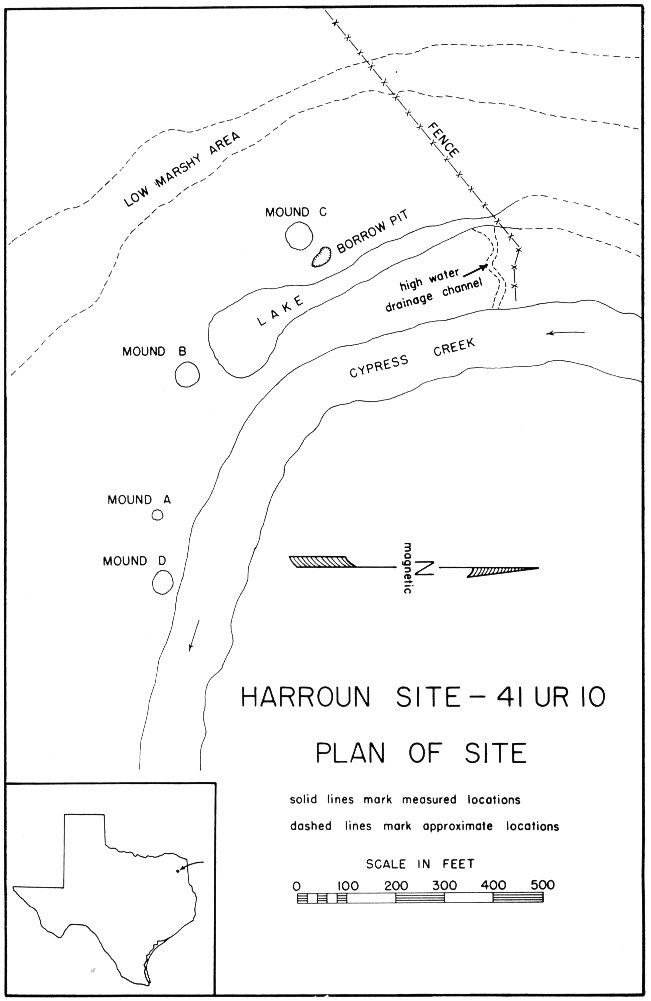 The Harroun Site was situated on the south floodplain of Cypress Creek on the outside of a large bend (Fig. 1). The only occupational features visible on the surface were four small mounds, round to slightly 6 oval in shape, with rounded tops. They were designated Mounds A, B, C, and D. A long, narrow lake, evidently surviving from an old cut-off channel of Cypress Creek, lay beside the creek channel in the northwestern part of the site.